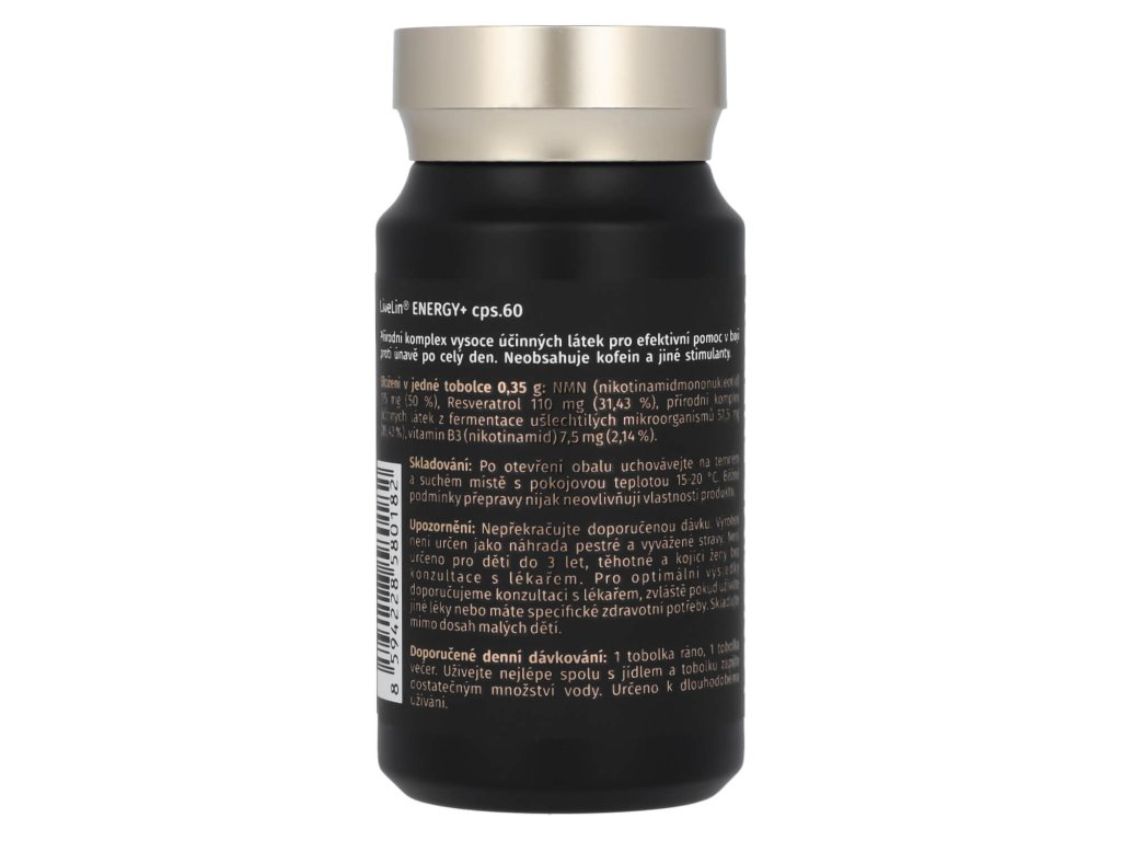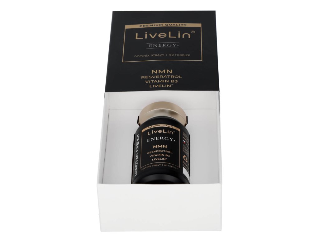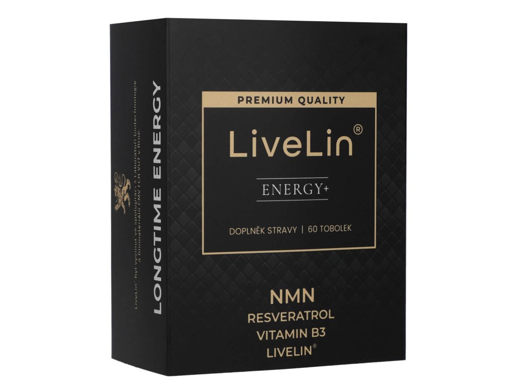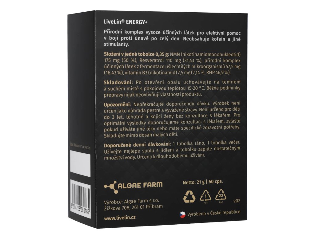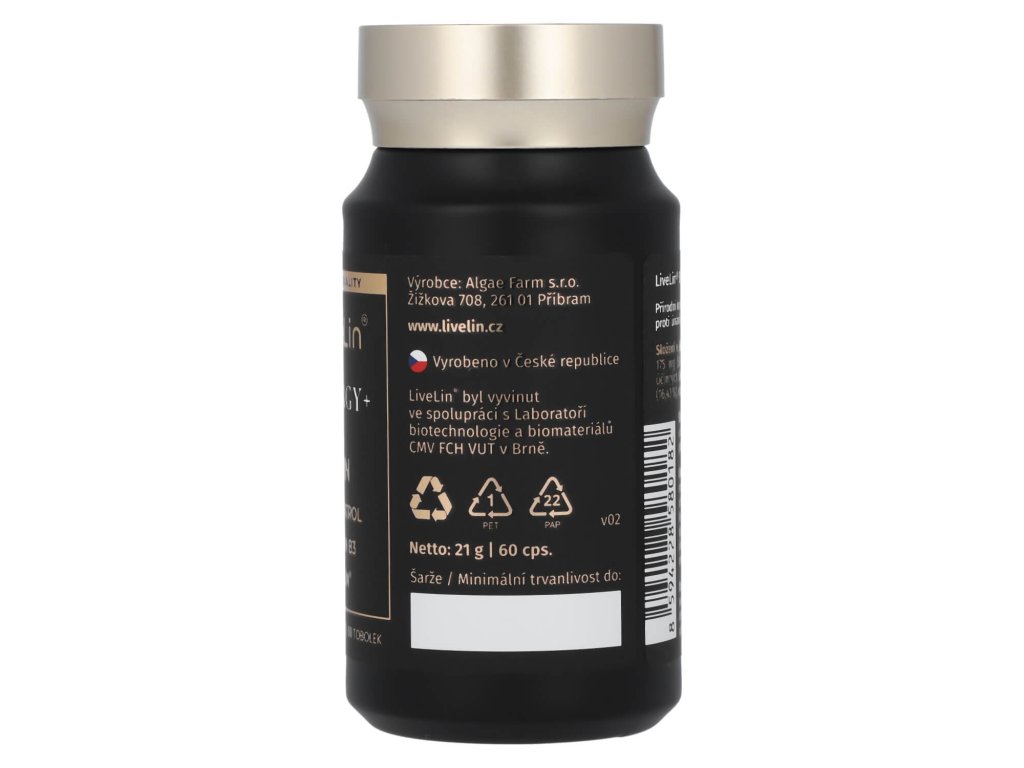 Doplněk stravy LiveLin® Energy+ je čistě přírodní komplex účinných látek podporujících správnou činnost nervového systému, kognitivních funkcí mozku a energetického metabolismu. Obsahuje unikátní mikronizovanou biomasu LiveLin®, vyrobenou biotechnologickým fermentačním procesem, při němž se využívají ušlechtilé mikroorganismy k produkci účinných látek nezbytných pro imunitu a trvalé zdraví. Je uložen v enterosolventní kapsli, která chrání před degradací látek žaludeční kyselinou a zajišťuje vstřebatelnost účinných látek v tenkém střevě. Neobsahuje kofein a jiné stimulanty, přídatné látky, barviva, ochucovadla ani stabilizátory.