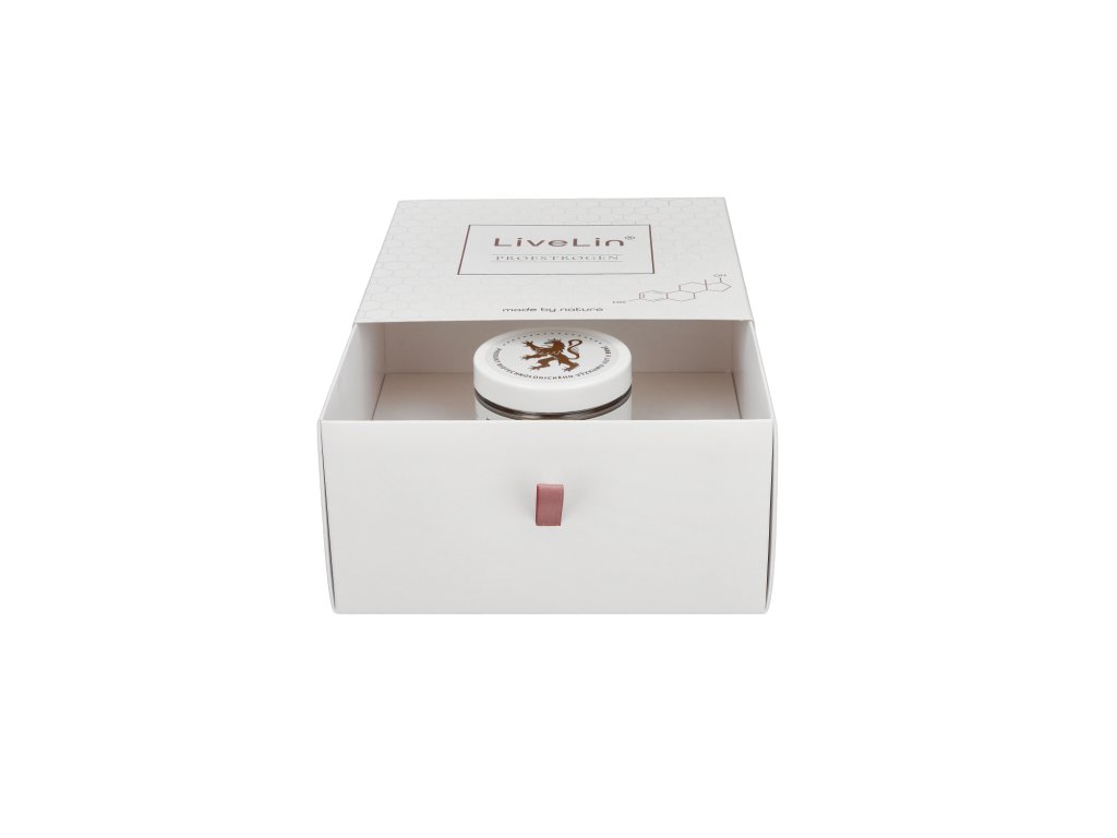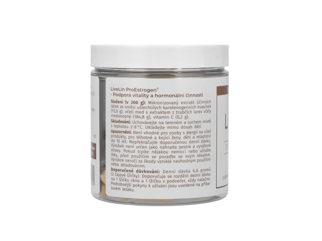Doplněk stravy LiveLin® ProEstrogen je čistě přírodní směs lyofilizovaného extraktu z trubčích larev včely medonosné (v pozdní fázi vývoje larvy) a mikronizované biomasy, vyrobené biotechnologickým fermentačním procesem, při němž se využívají ušlechtilé kvasinky k produkci účinných látek nezbytných pro dlouhověkost a trvalé zdraví. Směs je uložena v medové emulzi pro dokonalou ochranu před biodegradací účinných látek. Produkt neobsahuje žádné přídatné látky, barviva, ochucovadla ani stabilizátory.