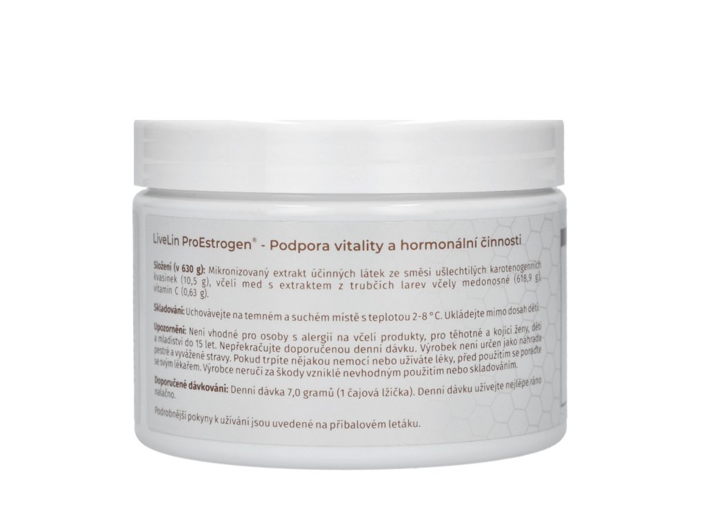 Doplněk stravy LiveLin® ProEstrogen je čistě přírodní směs lyofilizovaného extraktu z trubčích larev včely medonosné (v pozdní fázi vývoje larvy) a mikronizované biomasy, vyrobené biotechnologickým fermentačním procesem, při němž se využívají ušlechtilé kvasinky k produkci účinných látek nezbytných pro dlouhověkost a trvalé zdraví. Směs je uložena v medové emulzi pro dokonalou ochranu před biodegradací účinných látek. Produkt neobsahuje žádné přídatné látky, barviva, ochucovadla ani stabilizátory.